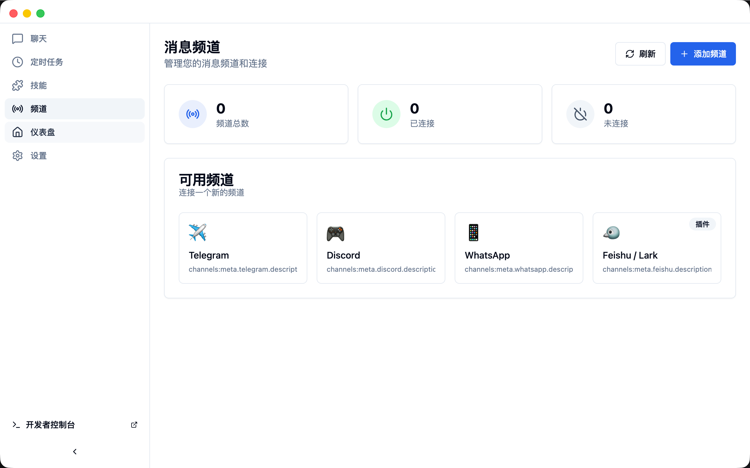 同时配置和监控多个 AI 频道。每个频道独立运行,允许你为不同任务运行专门的智能体。